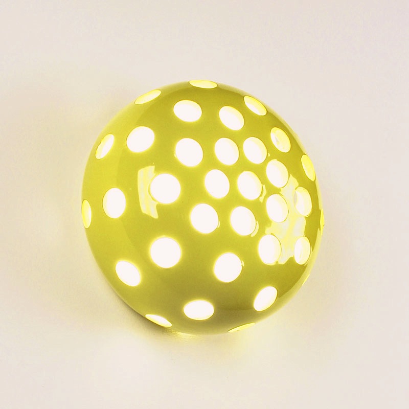 Applique smaltata realizzata totalmente in maniera artigianale. La sua forma a disco schiacciato è valorizzata da fori che generano un divertente effetto luminoso. L’applique non è dotata di corpo illuminante ma solo di paralume, questo offre ampio spazio di scelta e di configurazione del corpo illuminante, acquistabile in un comune negozio di elettricità. Si può adottare un portalampada tradizionale per interni o un faretto ad incasso o esterno, sia da esterni che da interni, un sistema led, delle dimensioni e del wattaggio desiderato. Per dimensioni e colori su richiesta scrivere a shop@archistyle.it