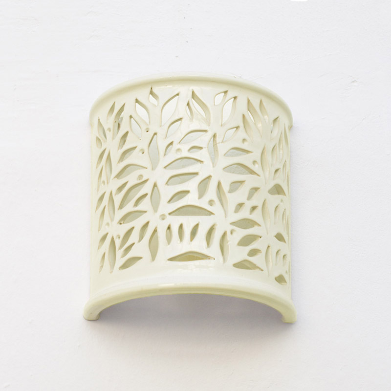 Applique colore panna in ceramica smaltata, da abbinare a qualsiasi comune portalampada, striscia led, faretto da incasso o esterno. Le dimensioni sono: altezza 23 cm larghezza 20 cm profondità massima 10 cm circa, con possibili leggere variazioni dovute alla lavorazione artigianale del prodotto e al ritiro durante l’asciugatura dell’argilla.